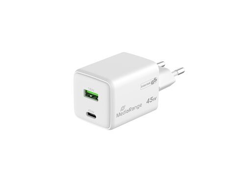 MediaRange 45W GaN Fast Charging Adapter (EU-Plug), 1x USB-C and 1x USB-A, USB-C® Power Delivery and Quick Charge enabled, White(MRMA113-2)