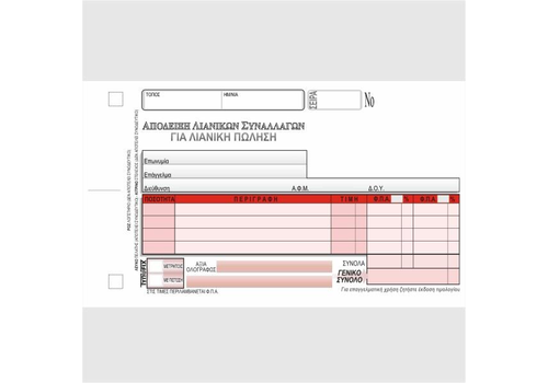 Έντυπο Απόδειξης Λιανικής Πώλησης απαραίτητο για την έκδοση χειρόγραφης απόδειξης λιανικής πώλησης προς ιδιώτες . Αυτογραφικό έντυπο που δεν χρειάζεται καρμπόν . Περιέχει σκληρό χαρτόνι που τοποθετείται ανάμεσα στα φύλλα για να μην γράφονται και τα υπόλοιπα . Με αναλυτικό πίνακα που περιγράφει τα είδη , την τιμή , την ποσότητα και δύο ΦΠΑ . Πλάτος φύλλων 10 εκατοστά και ύψος 18 εκατοστά . Πλήθος φύλλων 50 τριπλότυπα . Περφορέ φύλλα για εύκολη απομάκρυνση . Τρία αντίγραφα , άσπρο για τον πελάτη , ροζ για το λογιστήριο και κίτρινο στέλεχος .