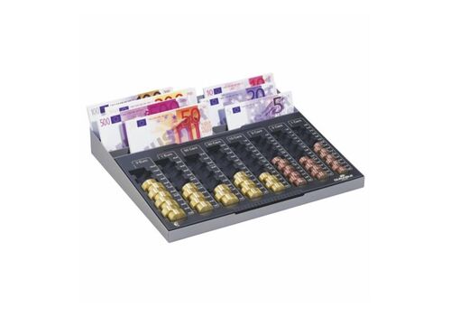 Μεταλλικός δίσκος με 8 θήκες για χαρτονομίσματα και κέρματα διαλογής, δίσκος που περιέχει 8 διαμερίσματα στοιβάγματος για όλα τα κέρματα του ευρώ. Θήκη χαρτονομισμάτων για προσωρινή αποθήκευση. Ικανότητα κερμάτων: 233.90€
