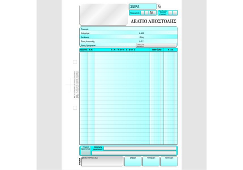Έντυπο Δελτίου Αποστολής απαραίτητο για την έκδοση χειρόγραφου δελτίου αποστολής προς επιχειρήσεις . Αυτογραφικό έντυπο που δεν χρειάζεται καρμπόν . Περιέχει σκληρό χαρτόνι που τοποθετείται ανάμεσα στα φύλλα για να μην γράφονται και τα υπόλοιπα . Με αναλυτικό πίνακα που περιγράφει τα είδη , την τιμή , την ποσότητα και τον ΦΠΑ . Πλάτος φύλλων 21 εκατοστά και ύψος 29 εκατοστά . Πλήθος φύλλων 50 τριπλότυπα . Περφορέ φύλλα για εύκολη απομάκρυνση . Τρία αντίγραφα , άσπρο για τον πελάτη , ροζ για το λογιστήριο και κίτρινο στέλεχος .