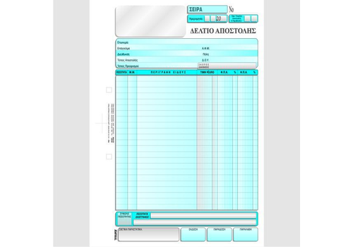 Έντυπο Δελτίου Αποστολής απαραίτητο για την έκδοση χειρόγραφου δελτίου αποστολής προς επιχειρήσεις . Αυτογραφικό έντυπο που δεν χρειάζεται καρμπόν . Περιέχει σκληρό χαρτόνι που τοποθετείται ανάμεσα στα φύλλα για να μην γράφονται και τα υπόλοιπα . Με αναλυτικό πίνακα που περιγράφει τα είδη , την τιμή , την ποσότητα και δύο ΦΠΑ . Πλάτος φύλλων 21 εκατοστά και ύψος 29 εκατοστά . Πλήθος φύλλων 50 τριπλότυπα . Περφορέ φύλλα για εύκολη απομάκρυνση . Τρία αντίγραφα , άσπρο για τον πελάτη , ροζ για το λογιστήριο και κίτρινο στέλεχος .