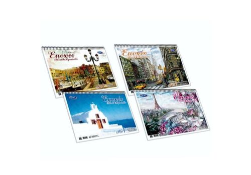 Μπλοκ ακουαρέλας Νο 4. Έχει εντυπωσιακό εξώφυλλο με απίθανα σχέδια και μαγευτικά χρώματα, που ζωντανεύουν την φαντασία κάθε επίδοξου καλλιτέχνη. Είναι κατασκευασμένο από ειδικό χαρτί που περιέχει βαμβάκι για την σωστή απορροφητικότητα της επιφάνειας του χαρτιού. Είναι κατάλληλο για πινέλα, ξυλομπογιές, νερομπογιές και λαδομπογιές.