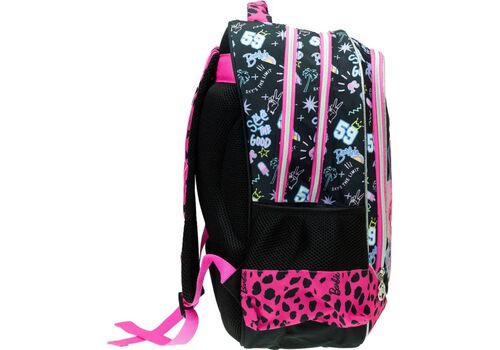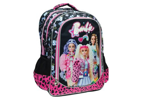 Σχολική τσάντα η οποία μπορεί να φορεθεί στην πλάτη, κατάλληλη για παιδιά δημοτικού της εταιρίας Gim με θέμα Barbie πολύχρωμη. Διαθέτει δύο κεντρικές θήκες, μία μικρότερη με φερμουάρ μπροστά και δύο πλαϊνές για παγούρι. Επιπλέον, έχει ενισχυμένους ιμάντες πλάτης και λαβή χειρός για ευκολότερη μεταφορά.