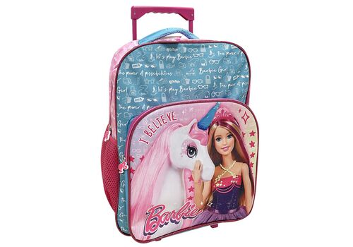 Σχολική τσάντα η οποία μπορεί να χρησιμοποιηθεί ως τρόλεϊ, κατάλληλη για παιδιά δημοτικού με θέμα Barbie σε ροζ χρώμα.
